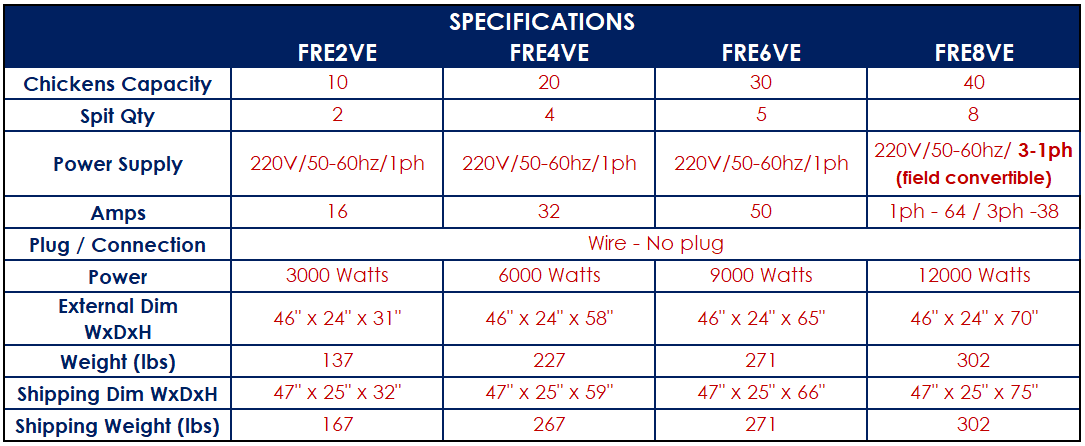 The AMPTO FRE6VE Electric Chicken Rotisserie Oven is a high-capacity commercial rotisserie designed for supermarkets, high-volume delis, and foodservice operations that require continuous roasting with consistent results. Featuring heavy-duty stainless steel construction and sliding tempered glass doors, the oven offers durability, easy sanitation, and excellent front-of-house product visibility. It uses V-style stainless-steel skewers that securely hold chickens without hooks, enabling faster loading and unloading. Each spit is driven by an independent motor rotating at a constant 2 RPM, ensuring uniform cooking and even browning across all levels. With a thermostat controller, indicator light, and efficient grease collection system, the FRE6VE delivers dependable electric rotisserie performance for demanding daily use.