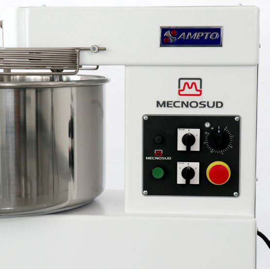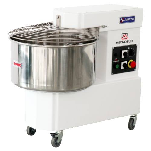 The AMPTO Mecnosud IM44DUS Spiral Mixer is a powerful, commercial-grade dough mixer designed for pizza shops, bakeries, and restaurants that require consistent performance and durability. Built in Italy, the IM44DUS features a stainless steel bowl, spiral hook, and shaft, ensuring hygienic operation and long service life in demanding kitchen environments. Its geared motor with a double-chain drive system delivers strong, reliable torque for uniform dough development, while the integrated timer allows operators to control mixing cycles with precision. Mounted on lockable casters and enclosed in a reinforced steel frame with non-toxic coating, the IM44DUS is ideal for high-volume dough production with stable, repeatable results.