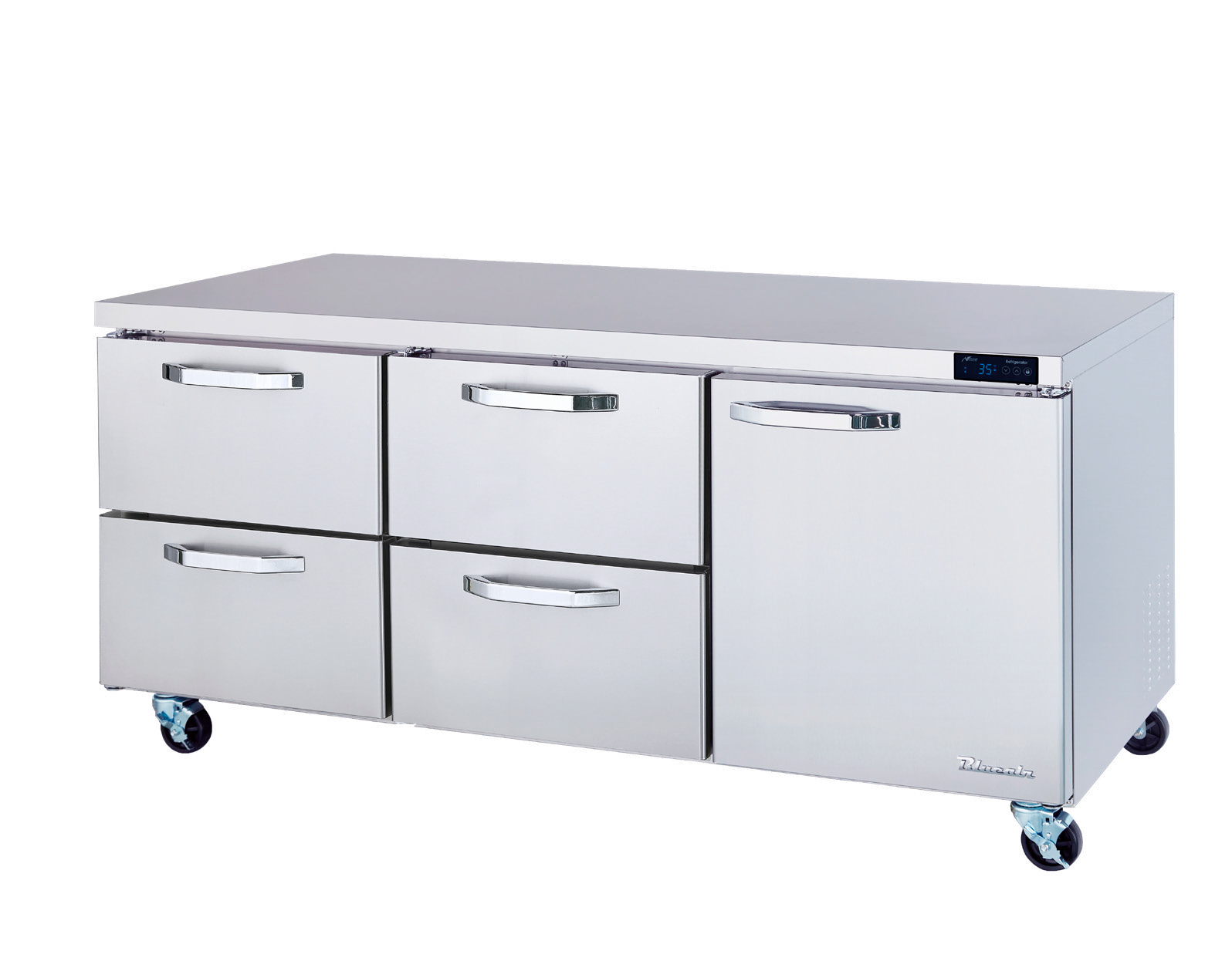 This model provides 20 cu. ft. of refrigerated storage with a convenient layout featuring four drawers and a single right-hand door, allowing chefs to organize and access ingredients quickly. Powered by an eco-friendly R-290 refrigeration system, the unit maintains safe storage temperatures between 33°F and 41°F, keeping perishable items fresh and ready for use.