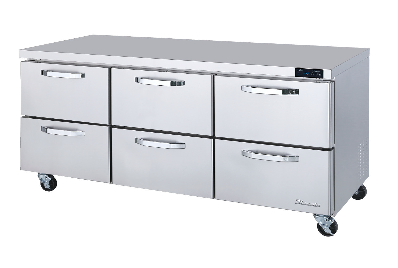 For convenience and flexibility, the BLUR72-D6-WT-HC includes swivel casters for easy mobility, heavy-duty drawer handles, and self-closing mechanisms that help maintain efficiency during busy operations. Optional low-profile casters are available to lower the unit’s height by up to 1.5 inches, making it easy to fit under standard-height worktables.
