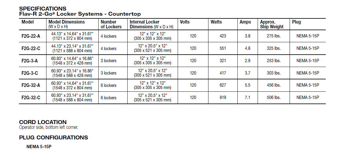 • Lockers preset to 150°F (66°C) for hot food holding
