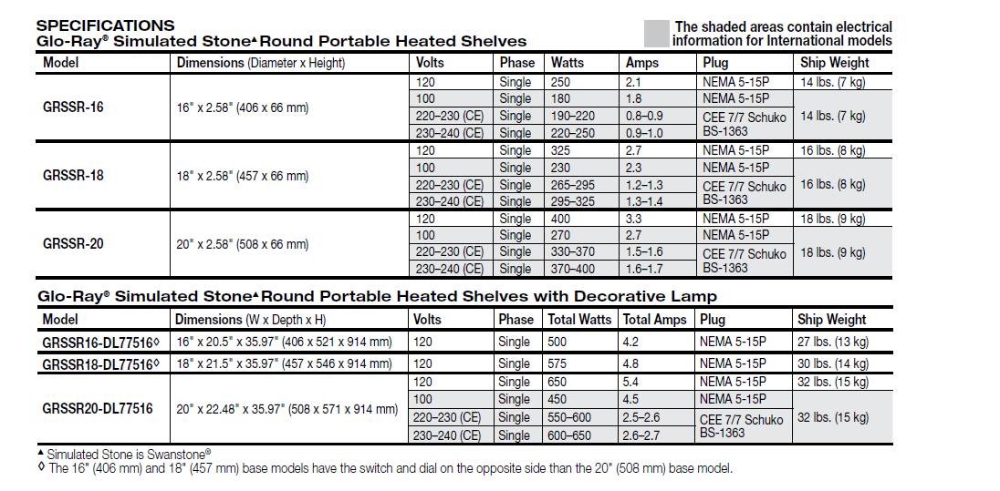 - Glo-Ray® Simulated Stone▲ Round Portable Heated Shelves