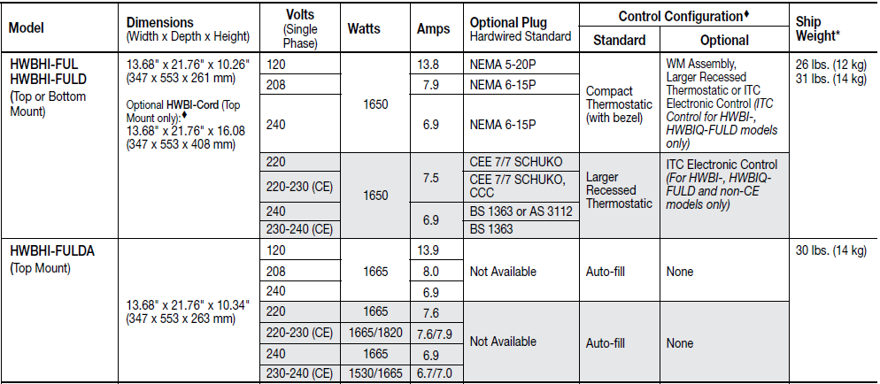 • Voltage options include 120V, 208V, 220V, and 240V depending on the model