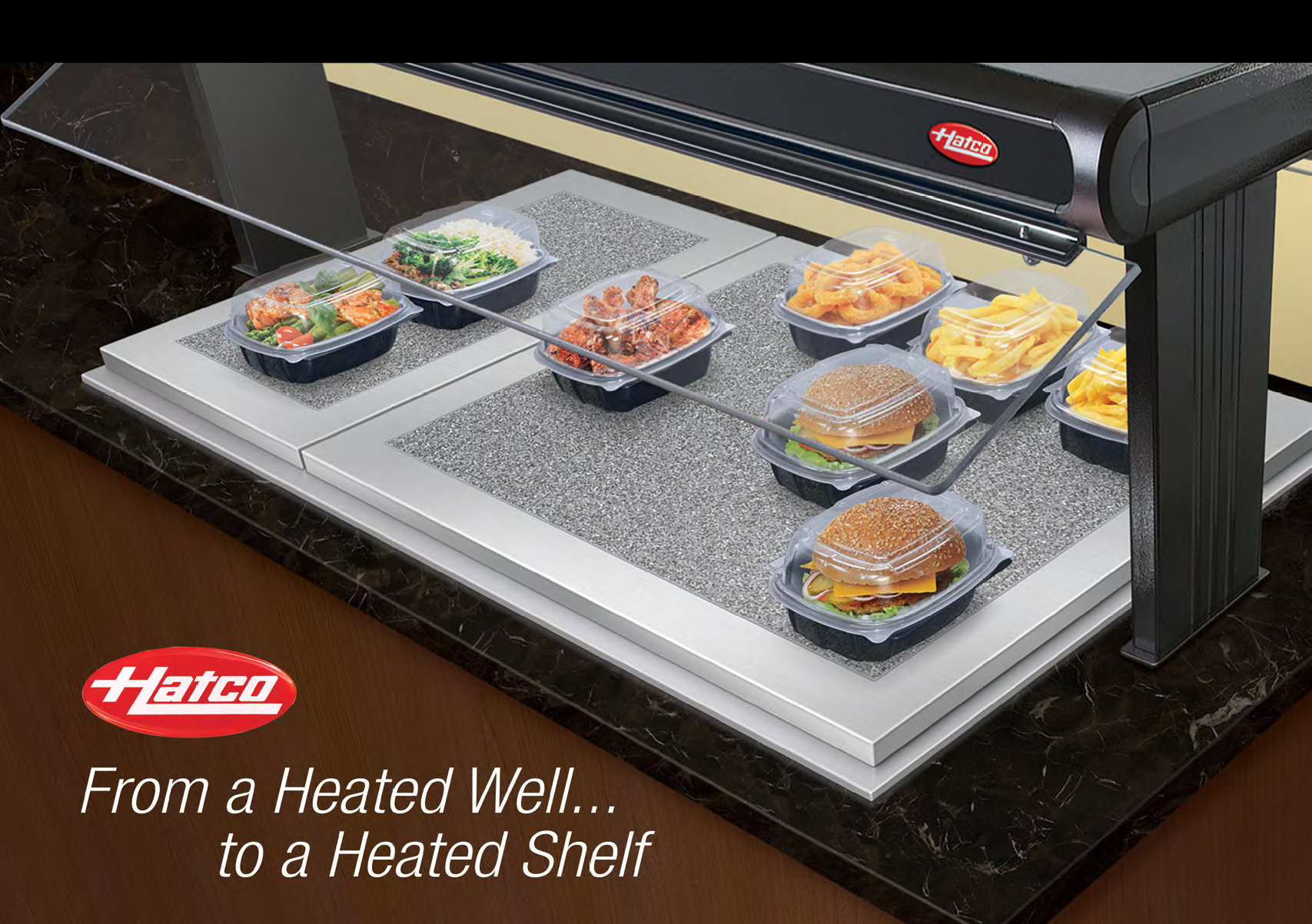 • Heated well covers with simulated stone surface convert the well into a heated shelf