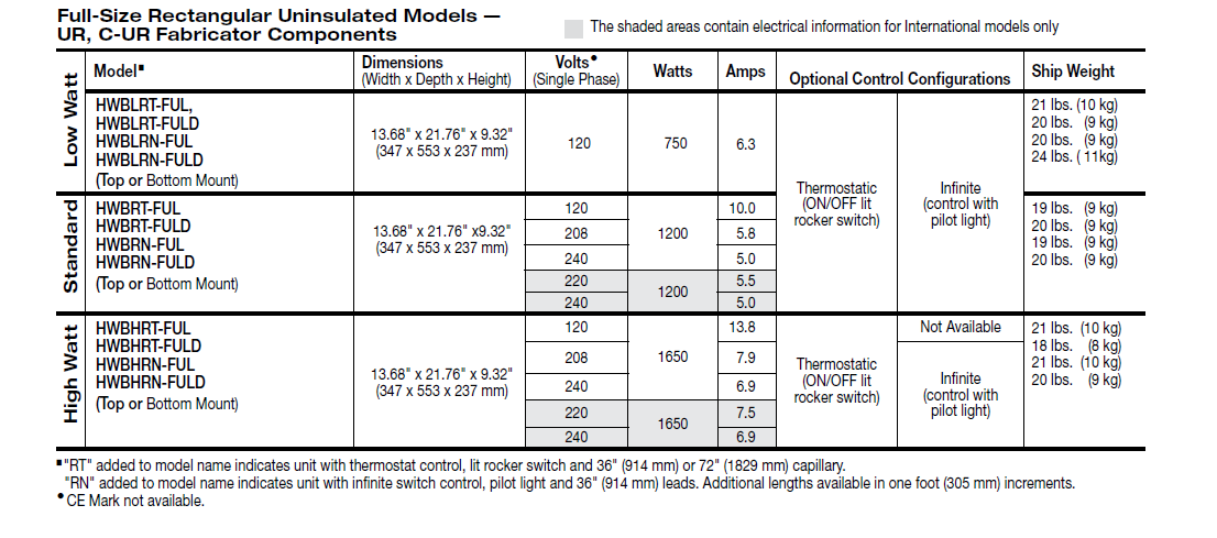 • “RT” models include thermostatic control; “RN” models include infinite control