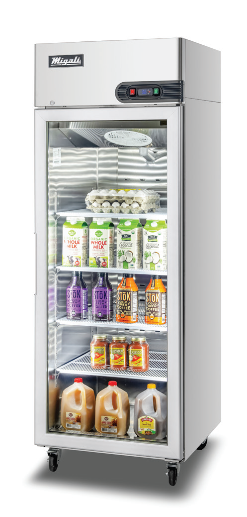 The Migali C-1RG-HC Competitor Series® one-section reach-in refrigerator is designed to keep ingredients fresh, organized, and easily accessible in high-demand kitchen environments. Its 21.4-cubic-foot interior provides ample storage space with three adjustable shelves that can be customized to fit a variety of items. Constructed with a durable stainless steel exterior and interior, this unit resists corrosion and ensures long-lasting performance while also simplifying routine cleaning. The top-mounted compressor maximizes usable cabinet space, making it an efficient choice for busy operations.