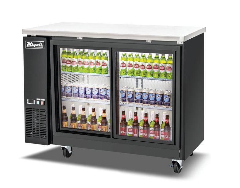 The Migali C-BB60SG-HC Competitor Series® bar refrigerator is a two-section back bar unit designed to provide both chilled beverage storage and attractive product display. Built for durability, it features a black, corrosion-resistant steel exterior paired with a polished stainless steel interior that withstands the demands of busy bar environments. Two sliding glass doors with safety-grip handles showcase stored beverages, while bright LED lighting highlights cans, bottles, and kegs for easy visibility. Inside, three adjustable shelf levels offer organized storage, and a stainless steel top doubles as a practical work surface for service or staging.