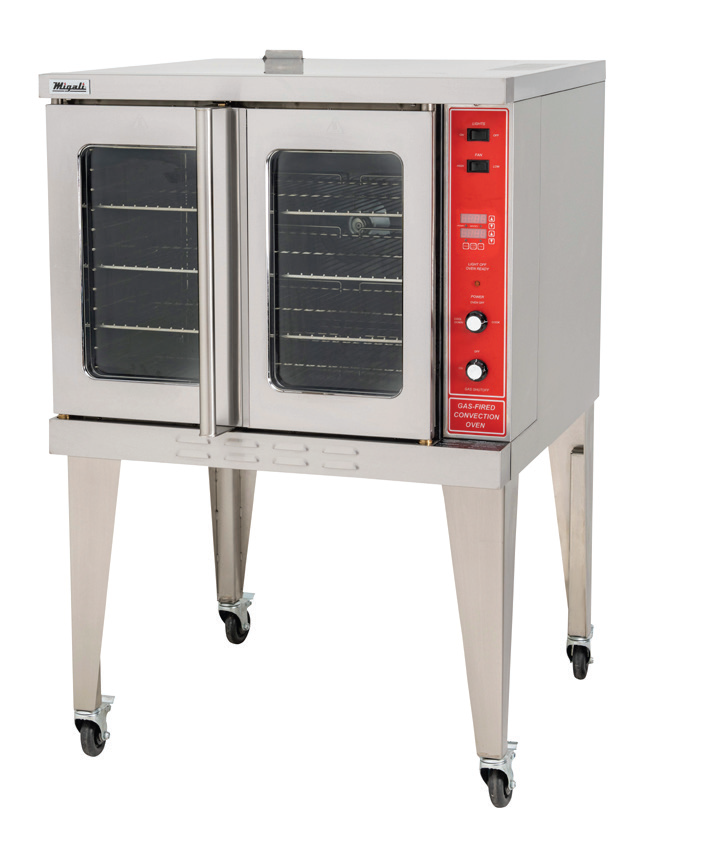 The Migali C-CO1-SD-NG Competitor Series® Single Full-Size Natural Gas Convection Oven delivers power, precision, and durability for demanding commercial kitchens. Built with a stainless steel exterior and an enamel-coated interior with coved corners, it ensures long-lasting performance and simplified cleaning. The oven’s dependent doors are fitted with double-pane thermal tempered glass to maintain internal heat while providing visibility, complemented by an interior light for clear monitoring during operation. Inside, the unit accommodates up to five full-size 18" x 26" pans on five nickel-plated racks with 13-position guides, offering flexibility for a variety of cooking needs.
