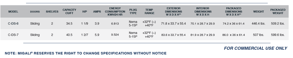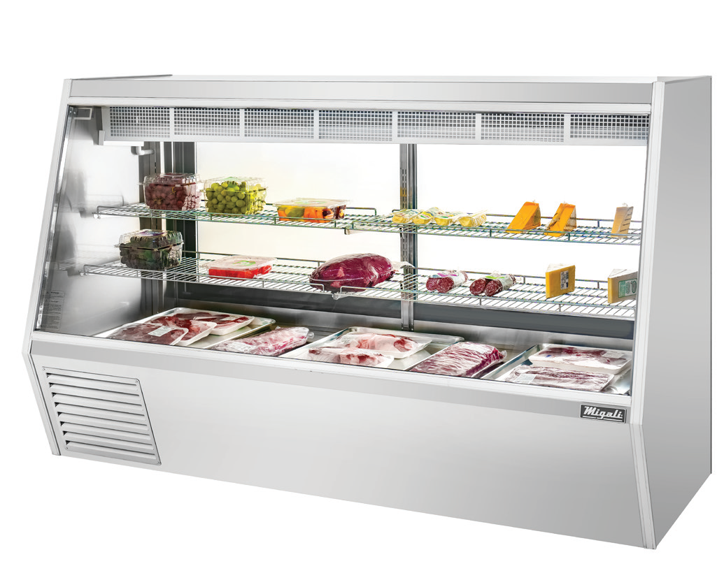 The ergonomic design includes sliding rear glass doors, LED interior lighting, and cantilever chrome-plated shelves to highlight products attractively. For user convenience, the unit comes with pre-installed casters and leveling feet, a rear water drain tube, and a top section floor drain to support efficient cleaning and operation. Using eco-friendly R290 hydrocarbon refrigerant, the case is also DOE certified for energy efficiency and backed by the Migali® Protection Plan, which includes a 2-year parts and labor warranty plus a 5-year compressor warranty.