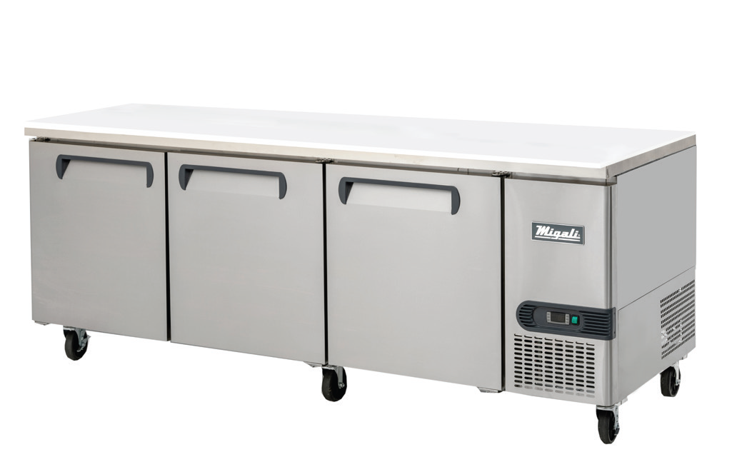 The Migali C-RWT93-HC Competitor Series® worktop refrigerator is built for heavy-duty commercial use, offering a spacious worktop surface for food preparation and a deep storage base to maximize back-of-house efficiency. Constructed with a stainless steel interior and exterior, this three-section unit includes solid hinged doors with recessed handles and pre-installed casters, ensuring durability, easy maneuverability, and streamlined workflows in busy kitchen environments.