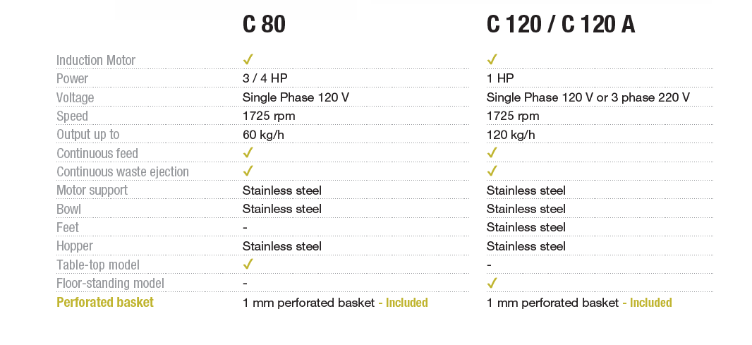 - Separate waste ejection chute for skins, pits, seeds, shells, and fibers