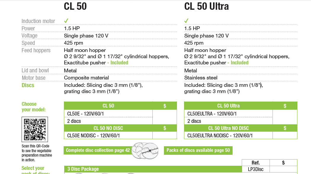 The Robot Coupe CL50E NO DISC Vegetable Preparation Machine is a powerful and highly versatile commercial food processor designed for high-volume vegetable processing in professional kitchens. Featuring a 1.5 HP industrial induction motor operating at 425 RPM, it ensures precise and efficient cutting for slicing, grating, shredding, dicing, and French fry preparation. Equipped with a dual hopper system for handling both bulky and delicate produce, along with a lateral ejection system for optimized workflow, it delivers consistent performance and operator convenience. With compatibility for a wide range of optional discs, the CL50E NO DISC provides flexibility for customized food preparation needs in medium to high-volume operations.