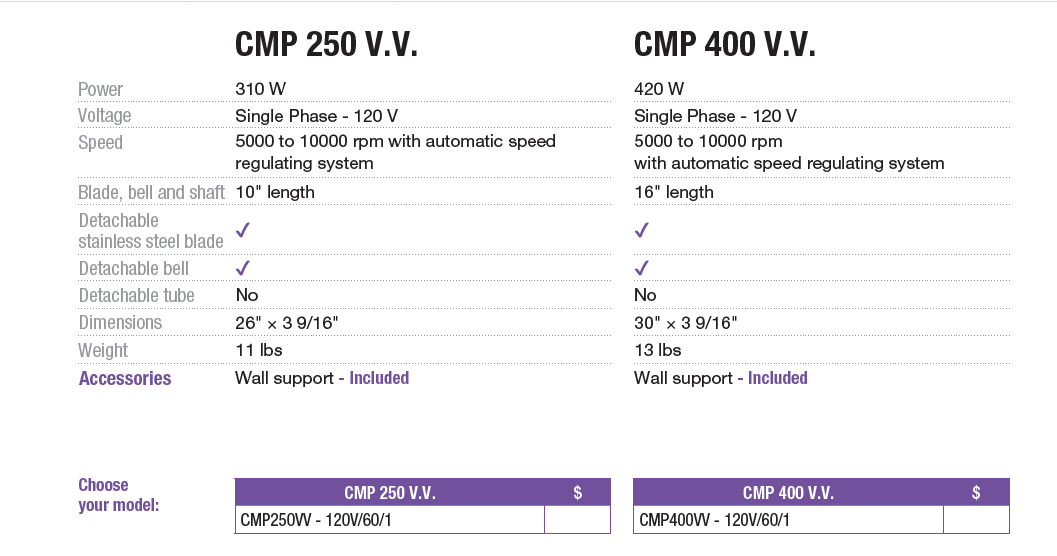 The Robot Coupe CMP 400 V.V. Power Mixer is a high-capacity, heavy-duty commercial hand blender designed for intensive catering and large-batch food preparation. Powered by a robust 420W motor with variable speed ranging from 5,000 to 10,000 RPM, it delivers powerful and consistent blending performance. Featuring a fully stainless steel shaft, bell, and blade assembly with an extended 16-inch length, it is ideal for deep containers and large-volume processing. Built with a durable stainless steel motor unit and ergonomic design, the CMP 400 V.V. ensures reliability, hygiene, and ease of use in demanding professional kitchen environments.