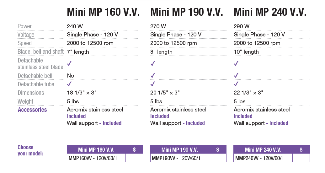 The Robot Coupe MMP 190 V.V. Power Mixer is a compact and efficient commercial hand blender designed for processing small to medium quantities with precision and control. Powered by a 270W motor with variable speed ranging from 2,000 to 12,500 RPM, it delivers excellent performance for blending, puréeing, and emulsifying. Featuring a fully stainless steel shaft, bell, and blade assembly, along with an ergonomic handle for comfortable use, it ensures durability and hygiene in professional environments. Ideal for soups, sauces, and emulsions, the MMP 190 V.V. is a reliable solution for kitchens requiring efficient small-batch processing.