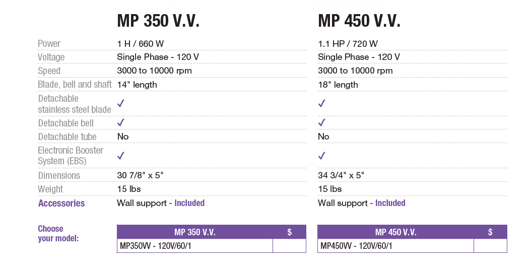 The Robot Coupe MP 350 V.V. Immersion Blender is a powerful and versatile commercial hand mixer designed for intensive use in catering and professional kitchens. Equipped with a 1 HP (660W) motor and variable speed control ranging from 3,000 to 10,000 RPM, it delivers precise and consistent blending performance across a wide range of applications. Featuring a 14-inch stainless steel shaft, bell, and blade assembly, along with a watertight stainless steel motor unit and patented EasyPlug detachable power cord system, it ensures durability, hygiene, and ease of maintenance. Ideal for blending soups, puréeing fruits and vegetables, and preparing sauces, the MP 350 V.V. is built for efficient medium-volume food preparation.