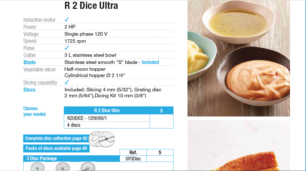 - Cutter attachment (lid + stainless steel smooth blade), vegetable prep attachment (chute, feed lead, discharge plate), 2 mm grating disc, 4 mm slicing disc, 10 mm (3/8”) dicing kit