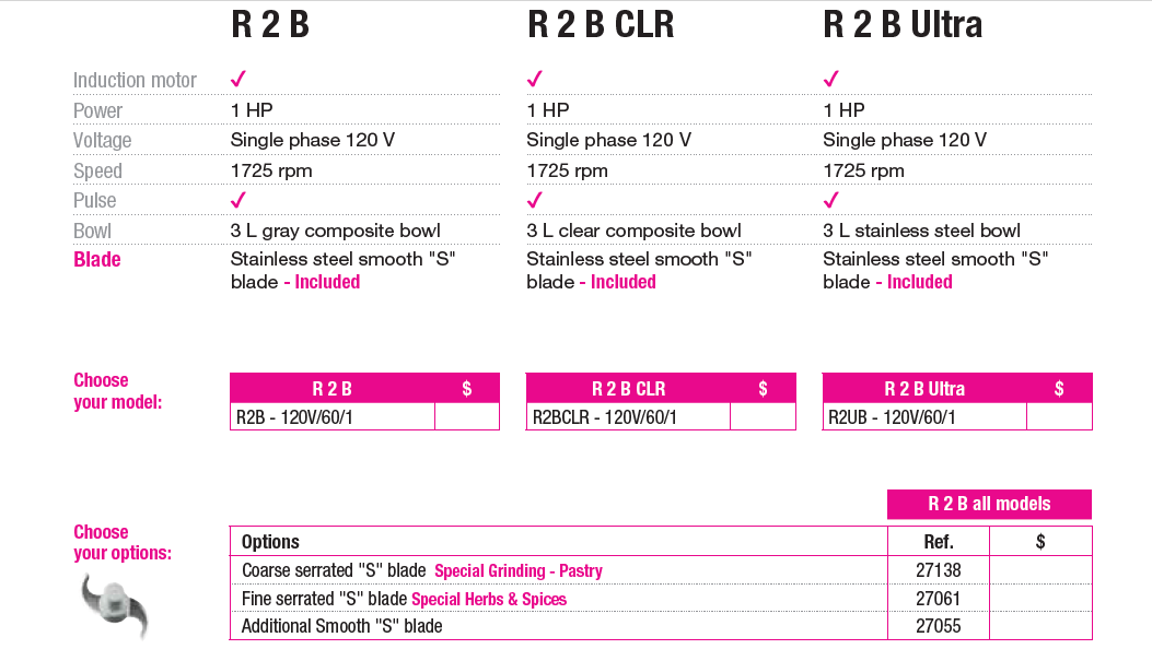 The Robot Coupe R2UB (R2B Ultra) Bowl Cutter Mixer is a durable and high-performance commercial food processor designed for efficient chopping, grinding, emulsifying, and kneading in professional kitchens. Powered by a 1 HP direct-drive induction motor operating at 1725 RPM, it ensures fast and consistent processing results. Featuring a 2.9-liter stainless steel cutter bowl for enhanced durability and hygiene, along with a transparent lid for monitoring operations, it provides both reliability and precision. Designed for intensive use, the R2UB is ideal for preparing mousses, emulsions, sauces, and finely processed ingredients with consistent, high-quality output.