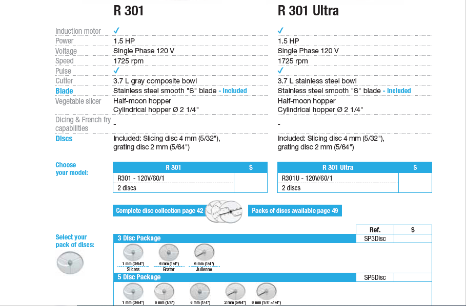 The Robot Coupe R301 DICE (R301 Ultra) Combination Processor is a versatile and high-performance commercial food processor designed for precision cutting, slicing, and dicing applications. Powered by a 1.5 HP direct-drive induction motor operating at 1725 RPM, it ensures reliable and consistent processing for demanding kitchen tasks. Featuring a 3.7-liter stainless steel cutter bowl and a vegetable preparation attachment with dual hoppers and side ejection, it offers excellent workflow efficiency. With its ability to handle chopping, emulsifying, slicing, grating, julienne, and dicing functions, the R301 DICE is ideal for small to medium kitchens requiring flexibility, precision, and productivity.