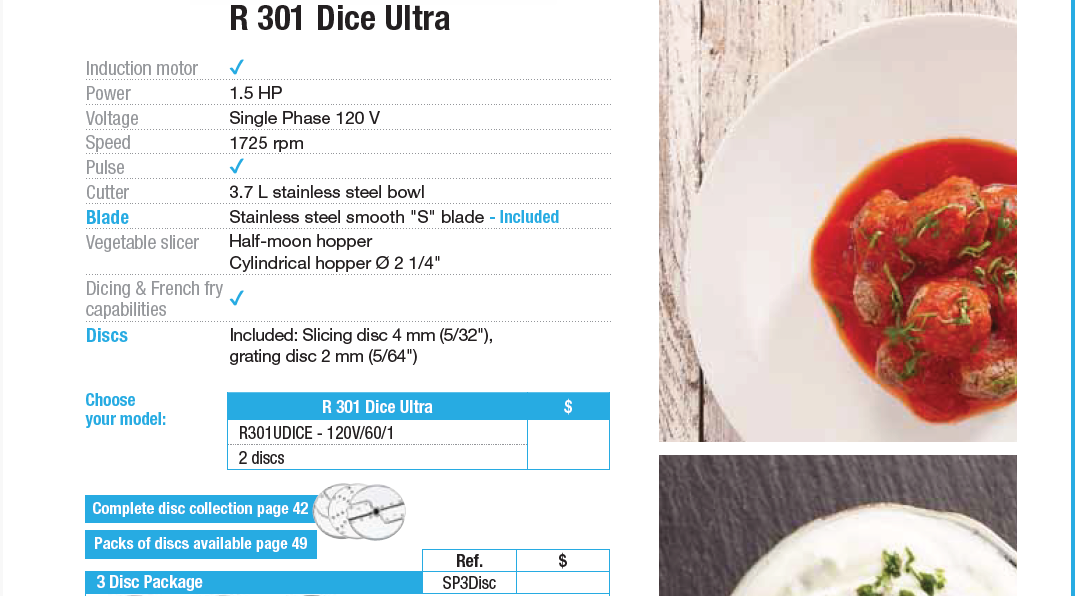 The Robot Coupe R301U DICE (R301 Ultra Dice) Combination Processor is a powerful and versatile commercial food processor engineered for precision cutting, slicing, and dicing in professional kitchens. Equipped with a robust 2 HP direct-drive induction motor operating at 1725 RPM, it delivers consistent performance for intensive food preparation tasks. Featuring a 3.7-liter stainless steel cutter bowl and a vegetable preparation attachment with dual hoppers and side ejection, it ensures efficient workflow and ergonomic operation. Supplied with an integrated dicing kit along with slicing and grating discs, the R301U DICE is ideal for kitchens requiring uniform cuts, high productivity, and multi-functional food processing capabilities.