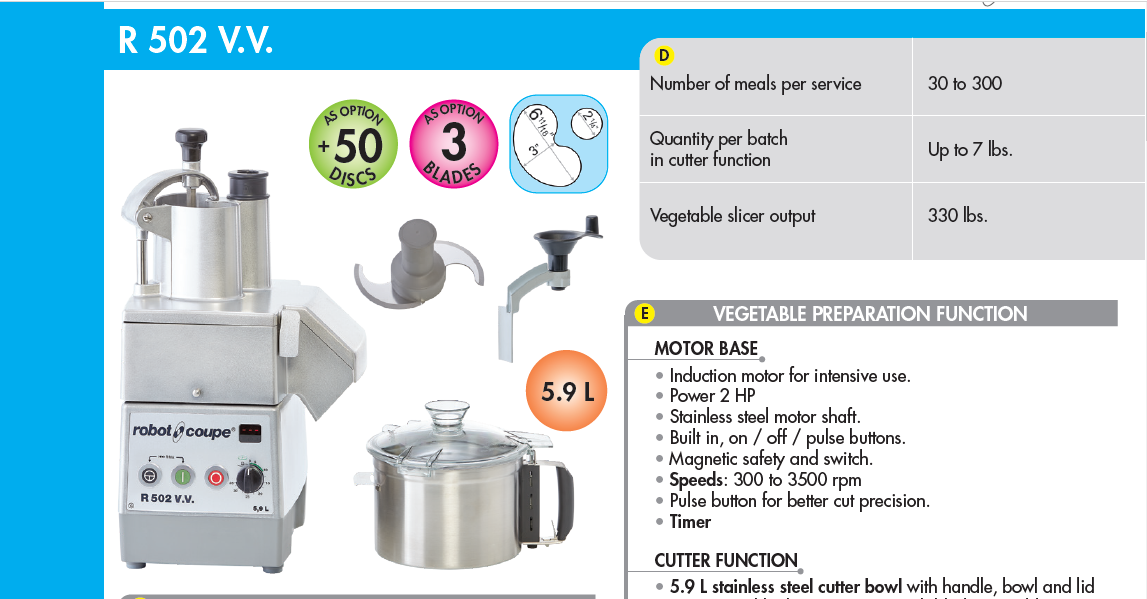 The Robot Coupe R502 V.V. Combination Processor is a powerful and versatile commercial food processing solution designed to handle both bowl cutter and vegetable preparation tasks with precision and efficiency. Featuring a robust 2 HP induction motor with variable speed control ranging from 300 to 3500 RPM, it offers unmatched flexibility for a wide variety of food processing applications. Its 5.9-liter stainless steel cutter bowl and advanced vegetable prep attachment with dual hoppers allow seamless processing of both small and large ingredients. Built for durability, performance, and ease of use, the R502 V.V. is ideal for professional kitchens requiring high productivity, consistent results, and multi-functional capability.