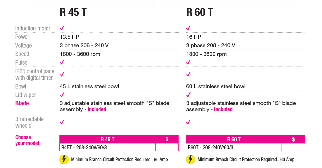The Robot Coupe R60T Vertical Cutter Mixer is an ultra-high-capacity, industrial-grade food processor designed for intensive food production in large-scale commercial kitchens. Equipped with a powerful 16 HP direct-drive induction motor and dual-speed functionality, it delivers exceptional performance for chopping, mixing, emulsifying, grinding, and kneading a wide range of ingredients. Its 60-liter stainless steel tilting bowl and advanced digital control panel with timer ensure precise operation and maximum efficiency. Built with a fully stainless-steel structure and supported by sturdy legs for stability, the R60T is engineered for durability, hygiene, and consistent high-volume output.