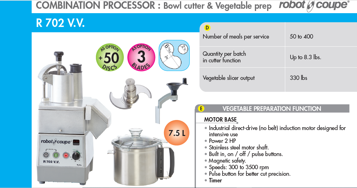 The Robot Coupe R702 V.V. Combination Processor is a high-capacity, variable-speed commercial food processor engineered for professional kitchens requiring precision, flexibility, and high productivity. Powered by a 2 HP industrial direct-drive induction motor, it features a wide variable speed range from 300 to 3500 RPM, allowing precise control over various food preparation tasks. Its 7.5-liter stainless steel cutter bowl and advanced vegetable preparation attachment with dual hoppers enable efficient processing of both small and large ingredients. Designed for durability and performance, the R702 V.V. excels in chopping, mixing, emulsifying, slicing, grating, and dicing, making it an ideal solution for medium to high-volume food operations.